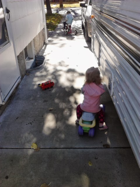Today was much nicer weather out, we were out playing for maybe an hour or so this time around. The kids were so excited for the gorgeous blue skies and all the colors of the leaves. It was such a pretty day outside! Man I love Montana! Alan instantly pulled out my old tricycle to ride around. He was getting the hang of riding again, when Miss Anna started fussing for a ride of her own. Thankfully, I found her a toddler scooter for her to use! It took sometime for her to figure out how to push the thing around, she started standing up and walking with it at first. But as soon as she figured it out, she was happy as a clam! She rode that thing up and down the driveway for maybe 20 whole minutes, silly girl only wanted to chase after big brother and just had to have wheels of her own! She is such an independent little lady! I love it so much! Just like her mama, girl power!